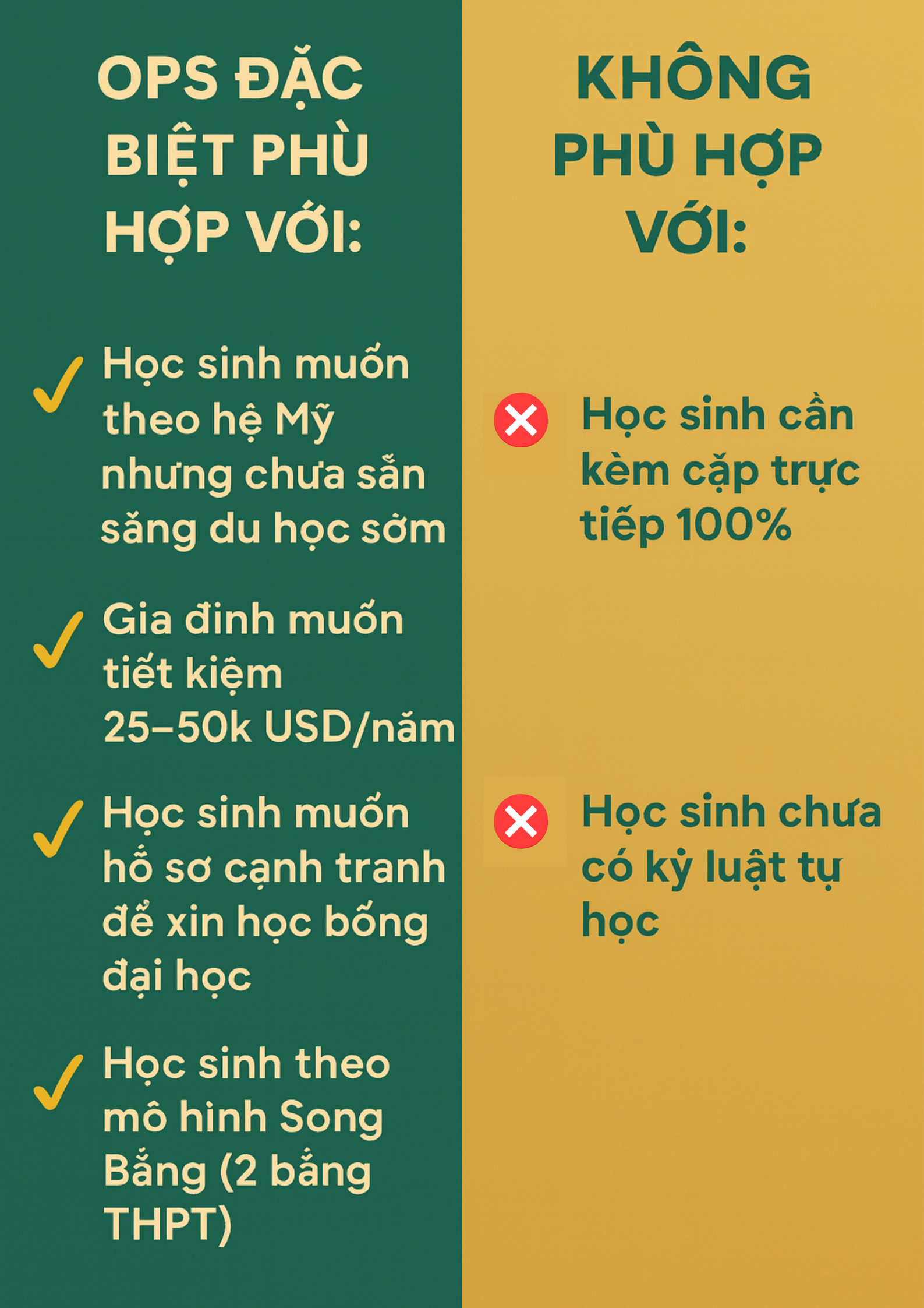 Tuy nhiên, với mô hình học Online Private School (OPS) – trường Mỹ dạy online được kiểm định đầy đủ – học sinh vẫn có thể nhận bằng THPT Mỹ (U.S. High School Diploma) nhưng không phải gánh các chi phí sống tại Mỹ, dẫn đến tiết kiệm từ $25,000 đến $50,000 mỗi năm.